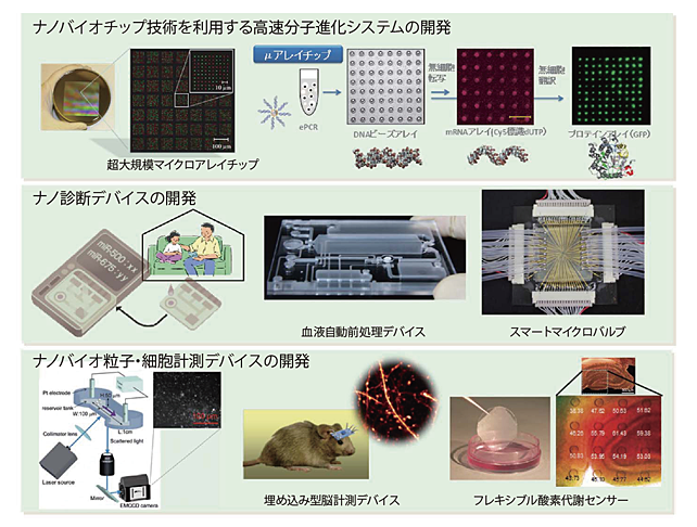 高度なナノ・マイクロファブリケーション技術と異種材料・デバイス統合化技術を基盤として高機能集積型バイオデバイス・システムを開発。革新的な診断機器や生体分子材料創出システムの開発を目指す。
