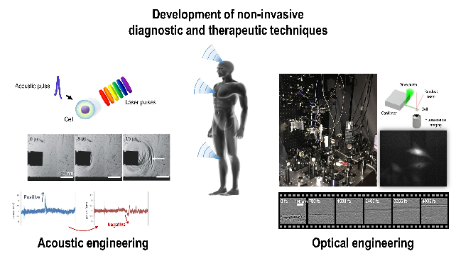 当グループでは、生体や細胞を操作し環境を変化させるツールとして音響波を用いることを目的とし研究を行っています。音響工学と光工学に基づき、これまでに独自の音響波発生装置や変調器を提案・実現しています。また、音響波と生体との相互作用を明らかにするため、最先端の超高速イメージング技術を開発しています。