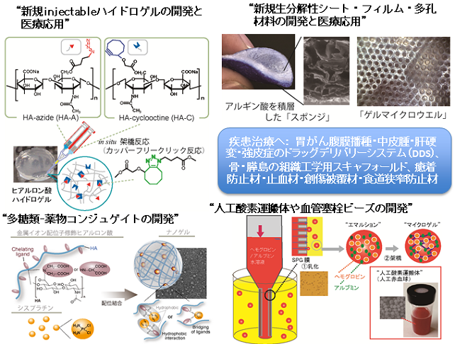新たな医療材料・機器開発を行います。アルギン酸、ヒアルロン酸、ゼラチン、アルブミンなどの生体高分子、樹状高分子などの合成高分子を出発物質に、injectableゲル・微粒子・不織布・スポンジなどを開発しています。臨床研究者と連携し、胃がん腹膜播種・中皮腫・肝硬変のドラッグデリバリーシステム(DDS)、骨・膵島の組織工学用スキャフォールド、癒着防止材・止血材・創傷被覆材などの医療機器への応用研究を行っています。化学工学・材料工学・生物工学を基軸とし、臨床応用に向けて附属病院との共同研究を積極的に進めています。
