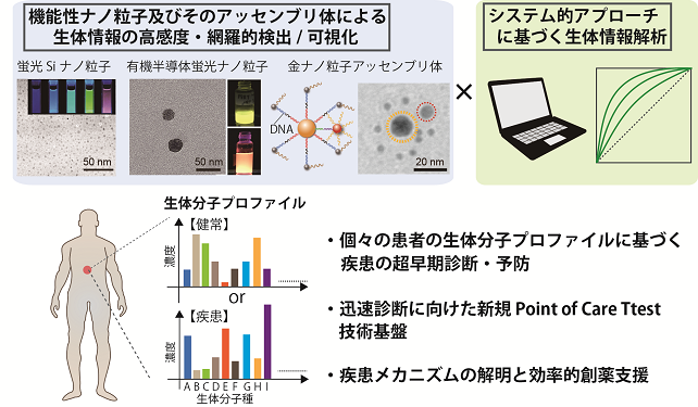 生体中では、無数の生体分子が織り成す相互作用によって生命現象が作り出されています。当研究室では、機能性ナノ粒子を用いてこの相互作用を高感度・網羅的に検出/可視化する技術基盤を開発し、生体をシステムとして捉えたデータ解析と融合することで、新たな医療診断プラットフォームを開拓していきます。これにより、発症してしまってからでは治療が困難な疾患の超早期診断や個別化医療、創薬の効率的支援を目指します。化学工学を軸とし、システム的視点から医学や生物学の知見を組み込むことで、研究を推進していきます。