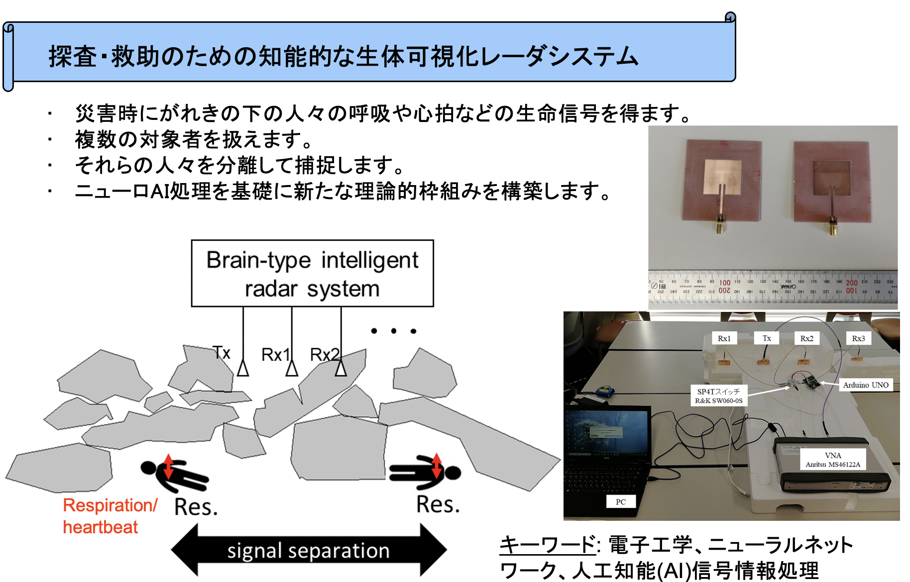 (2) またセンシング・イメージングシステムは、そこで得られた情報を情報ネットワークに送り高度な処理を実現してゆきます。その際、通信ケーブルや電源ケーブルが無いことが望まれます。またセンシング・イメージングそのものも、非接触、非侵襲であることが望まれます。電波や光波を利用し、AIに基づく適応処理を実現することにより、それら新機能を実現します。