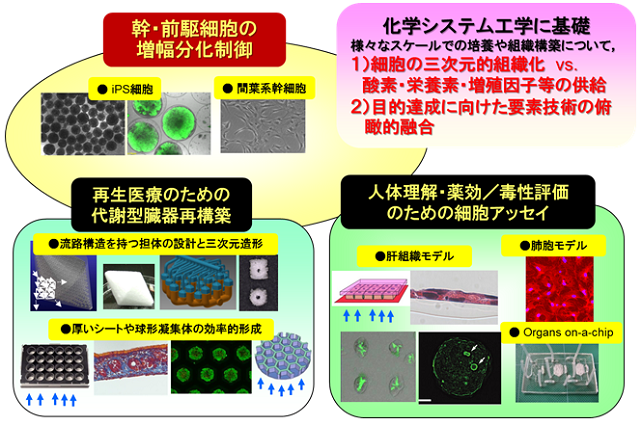 再生医療や薬・化学物質等のヒト影響評価(細胞アッセイ)への利用を目指し、幹細胞や臓器由来細胞を様々なスケールで培養・組織化する研究を行っている。物質交換を確保しながら細胞の生理学的な階層的三次元化を行ったり、最新の生物学医学的知見や工学的技術を融合利用したりするため、化学システム工学の方法論や考え方に強固な基礎を置き、教育研究を行っている。