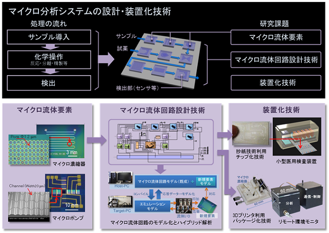 マイクロ流路や、マイクロミキサ、マイクロポンプなどのマイクロ流体要素のモデル化及びそれらを集積化したマイクロ流体システムの設計技術を開発・整備することで、バイオ・医療・環境向けのマイクロ分析システムや化学生産向けマイクロリアクタの集積化、装置化を加速・支援する。
